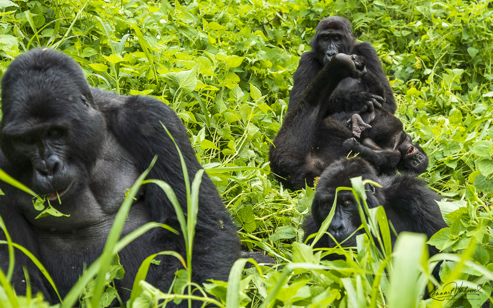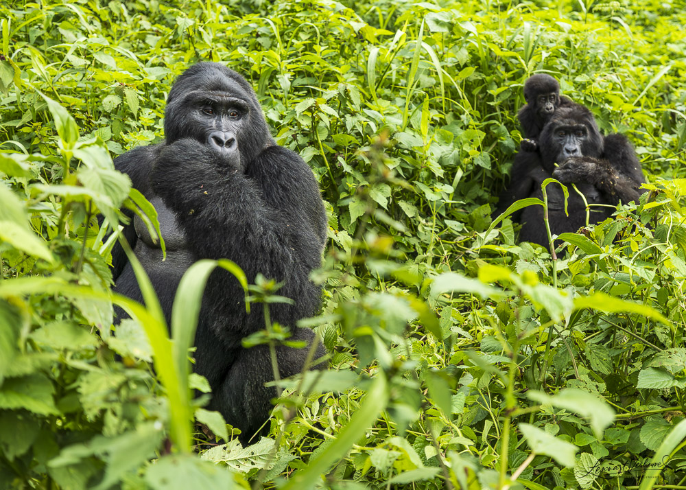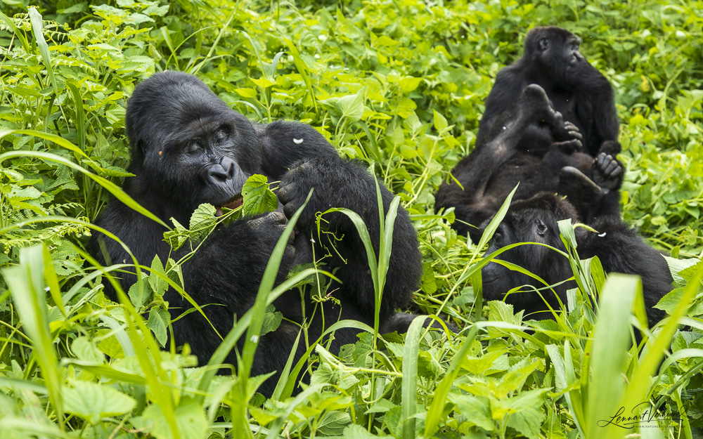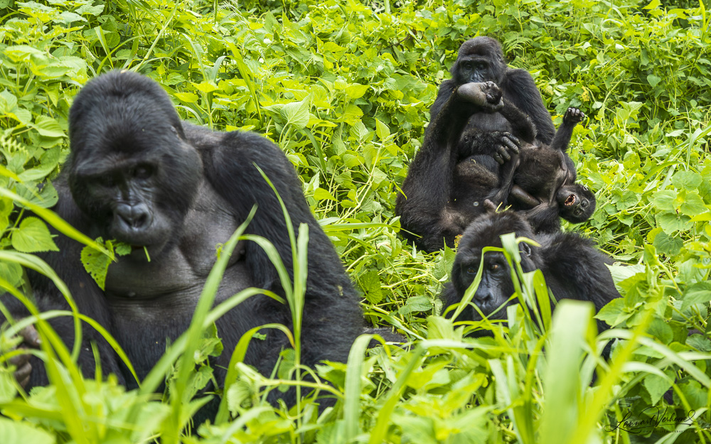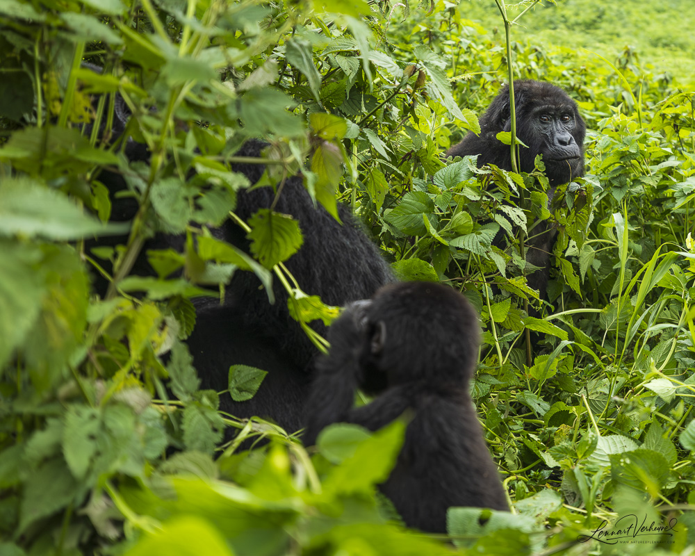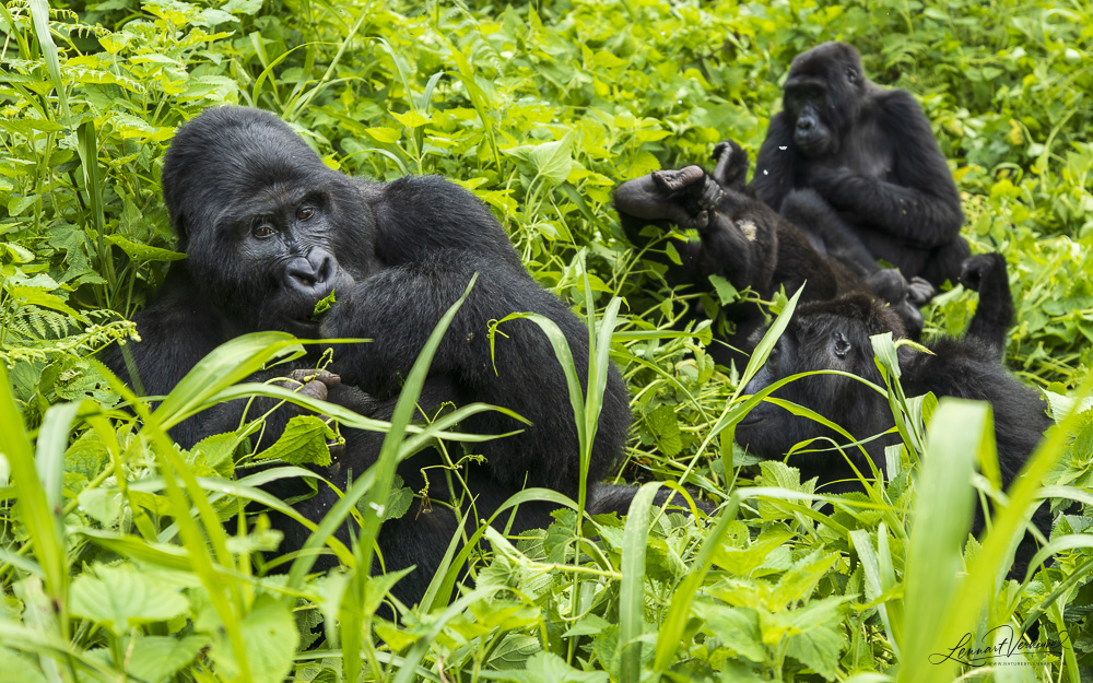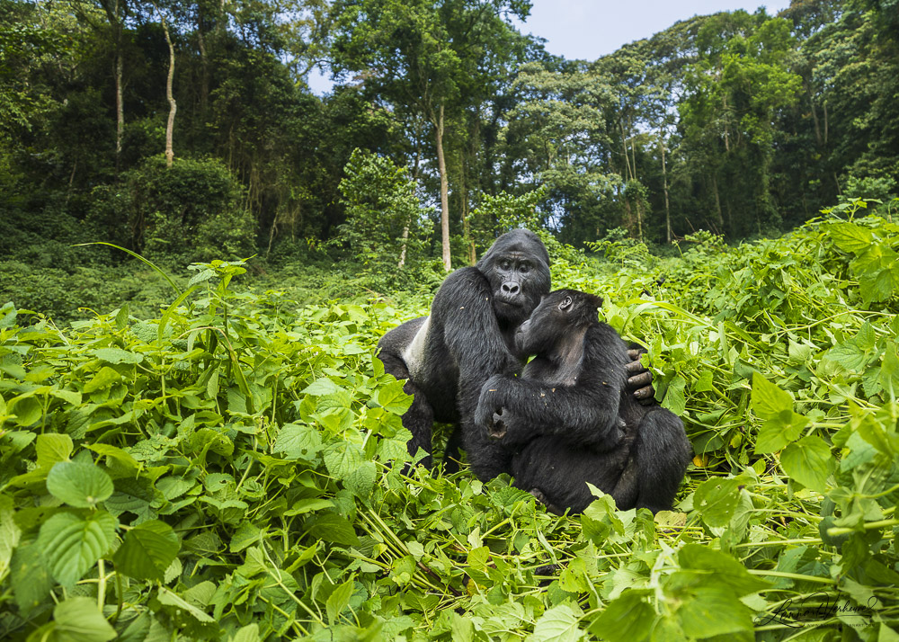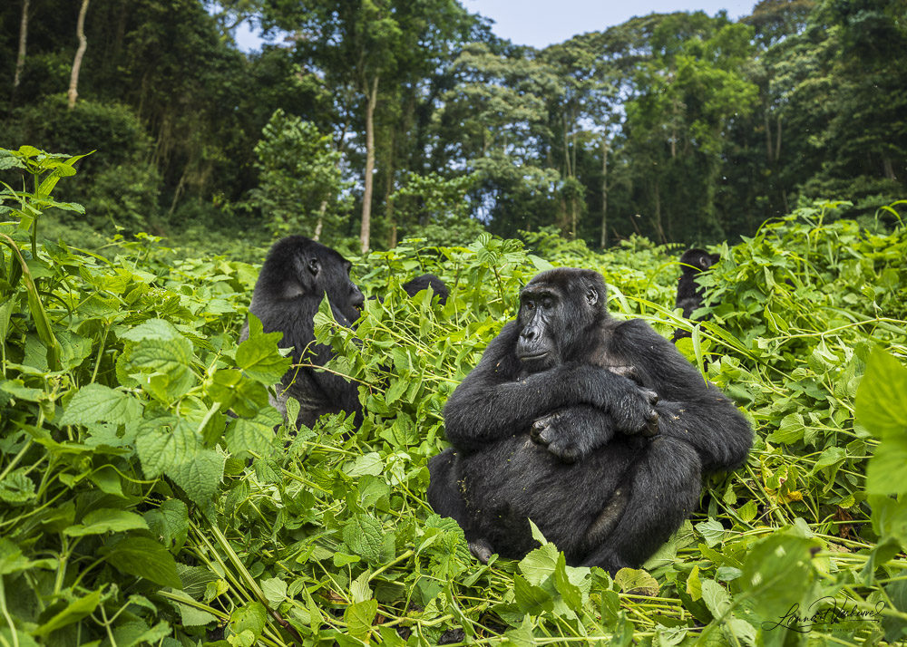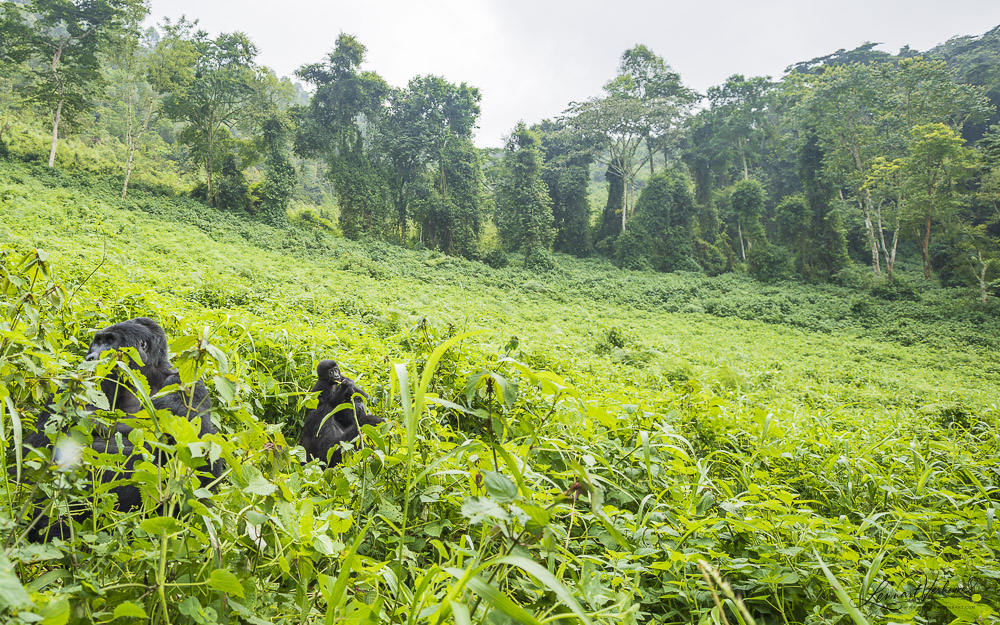 Thankfully, that wasn’t the case. After hiking a while, we climbed a ridge and were rewarded with a sweeping view of untouched rainforest. Our family was nearby, and after half an hour’s descent, we stepped into a large open clearing. Right there, in the middle, sat the gorillas!