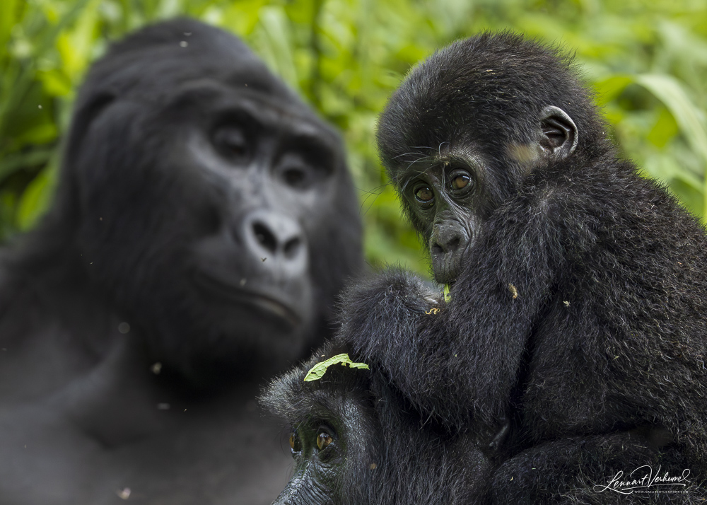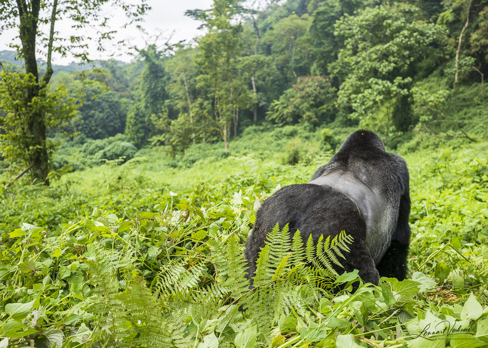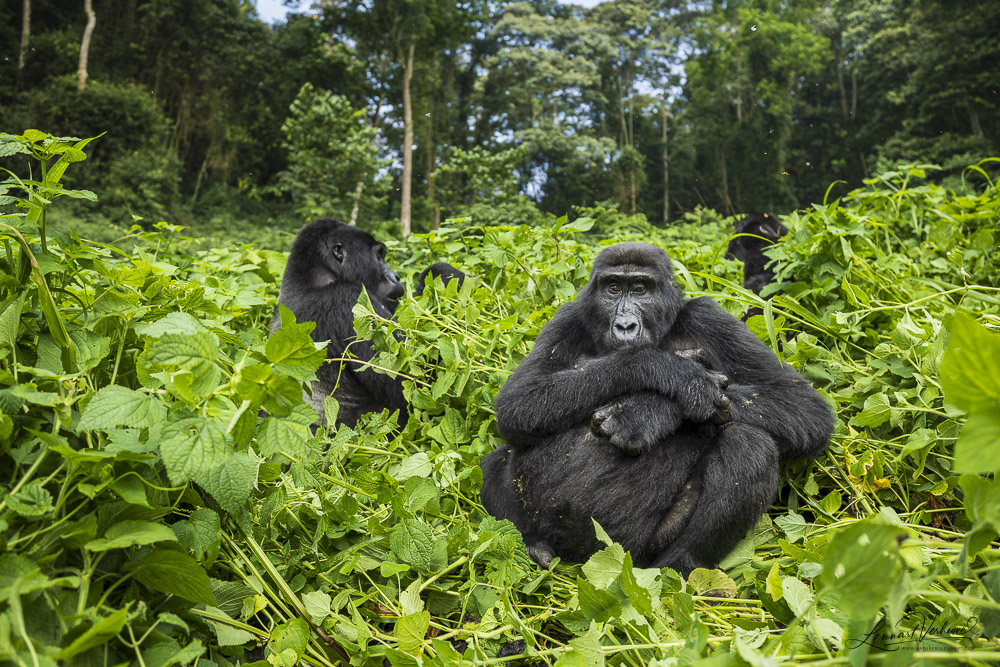 As our time ended, the gorillas themselves decided to leave, slowly moving towards the trees. The silverback urged one of his females to follow, giving me one of my favorite photos of the day.