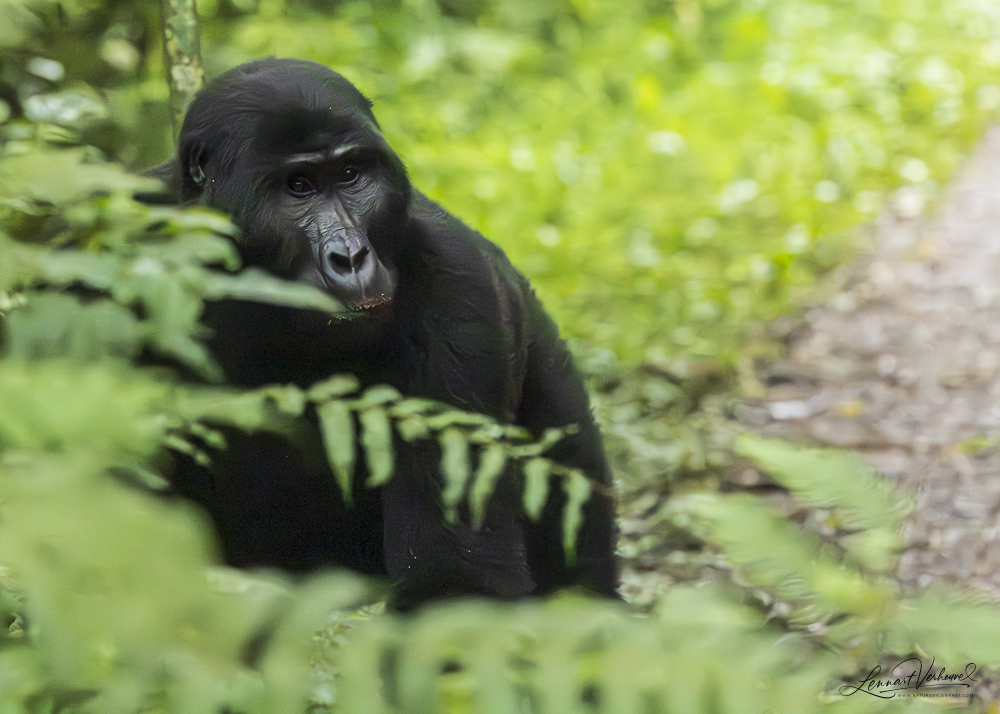 What I did see was another gorilla: a blackback male suddenly appeared at the end of the trail! I had stepped aside briefly for a restroom break when he emerged right behind me!