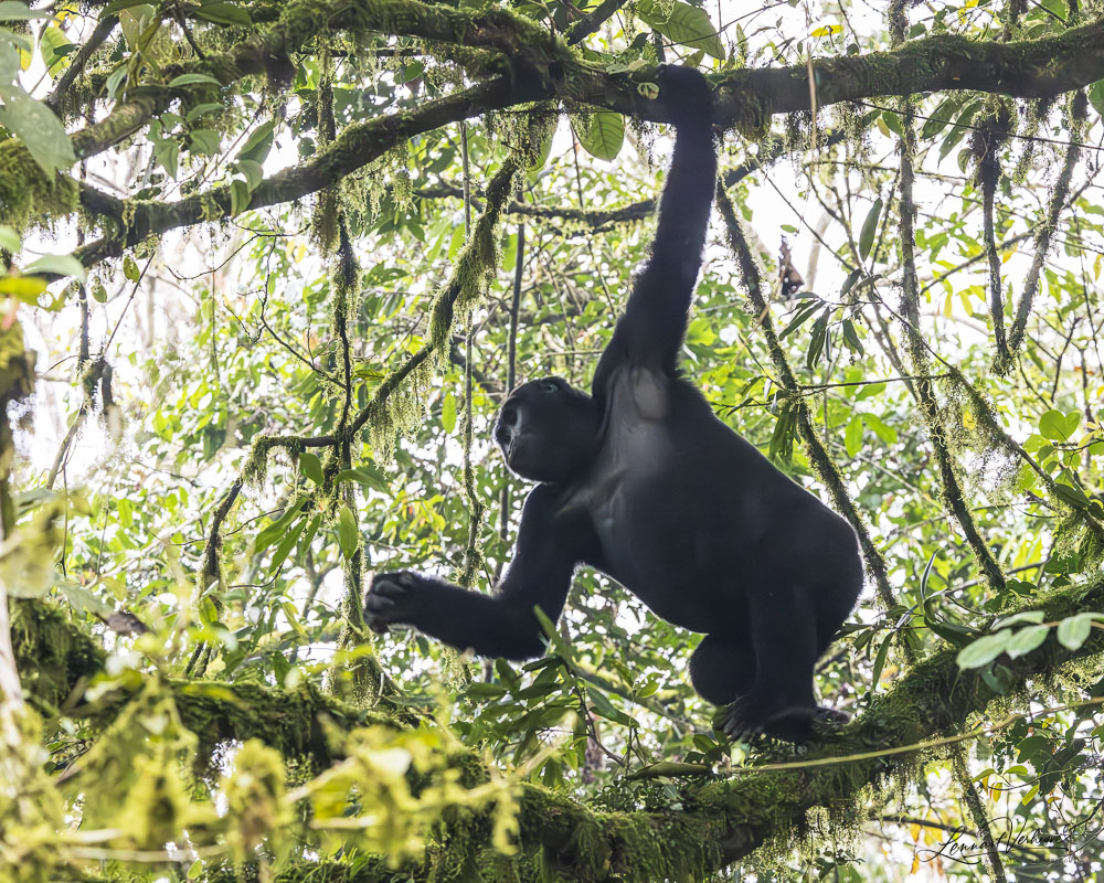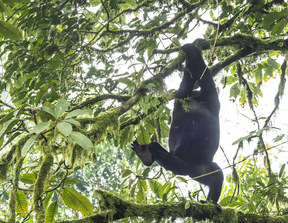 Clearly from a habituated group, he showed no fear, casually crossing the path and climbing a tree—probably preparing a nest for the night.
