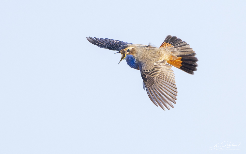 During a spring morning of birding, I spent some time with a Bluethroat performing song flights. I was happy with the result, showing everything: both the blue throat and the beautiful, characteristic tail. It was still a bit far away, but with a crop it doesn’t look bad at all.