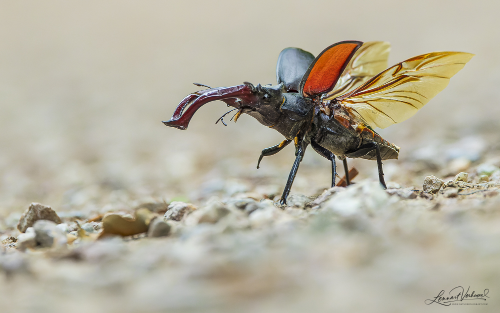 A morning spent searching for wolves on the Veluwe ended, as usual, in disappointment—but I was very happy to finally see my first Stag Beetle! I was even treated to a flight display. Well, “smooth” might be an overstatement, but it was great to see how this beetle attempted to fly. During take-off, all wings were spread, which immediately gave a very different appearance.